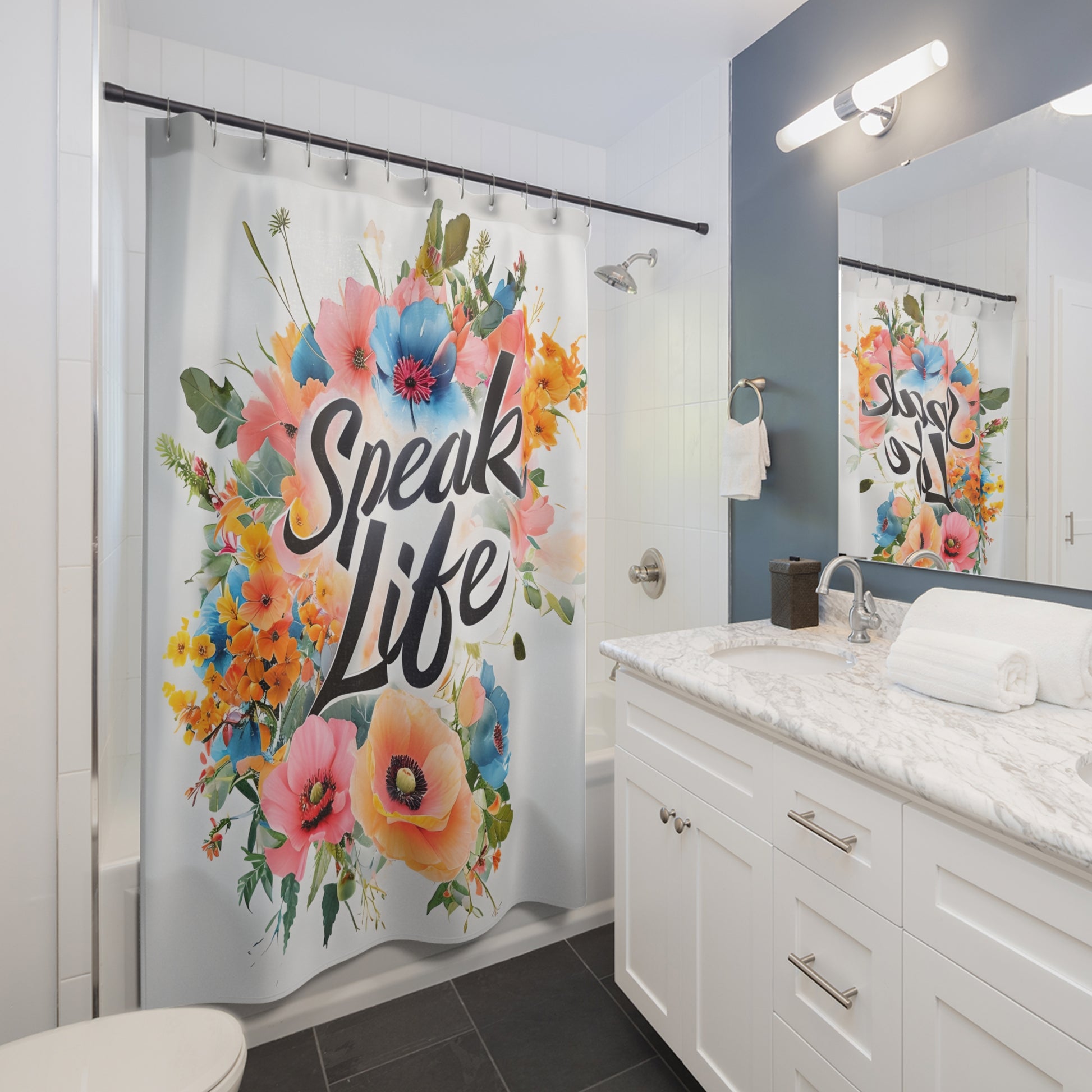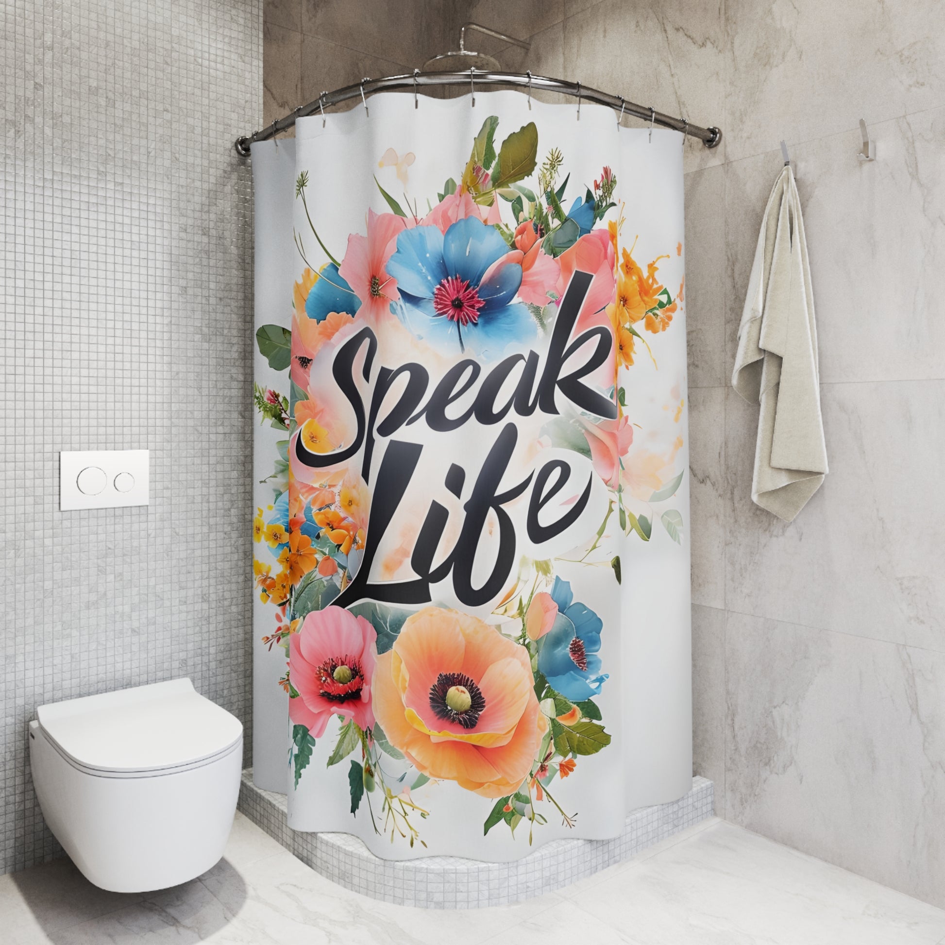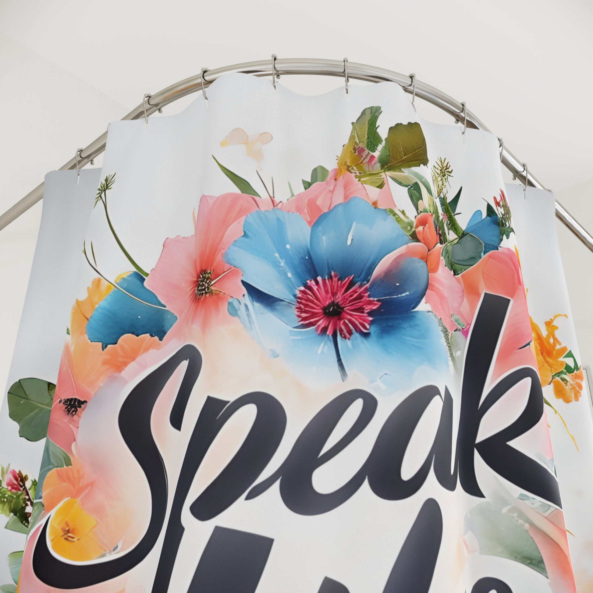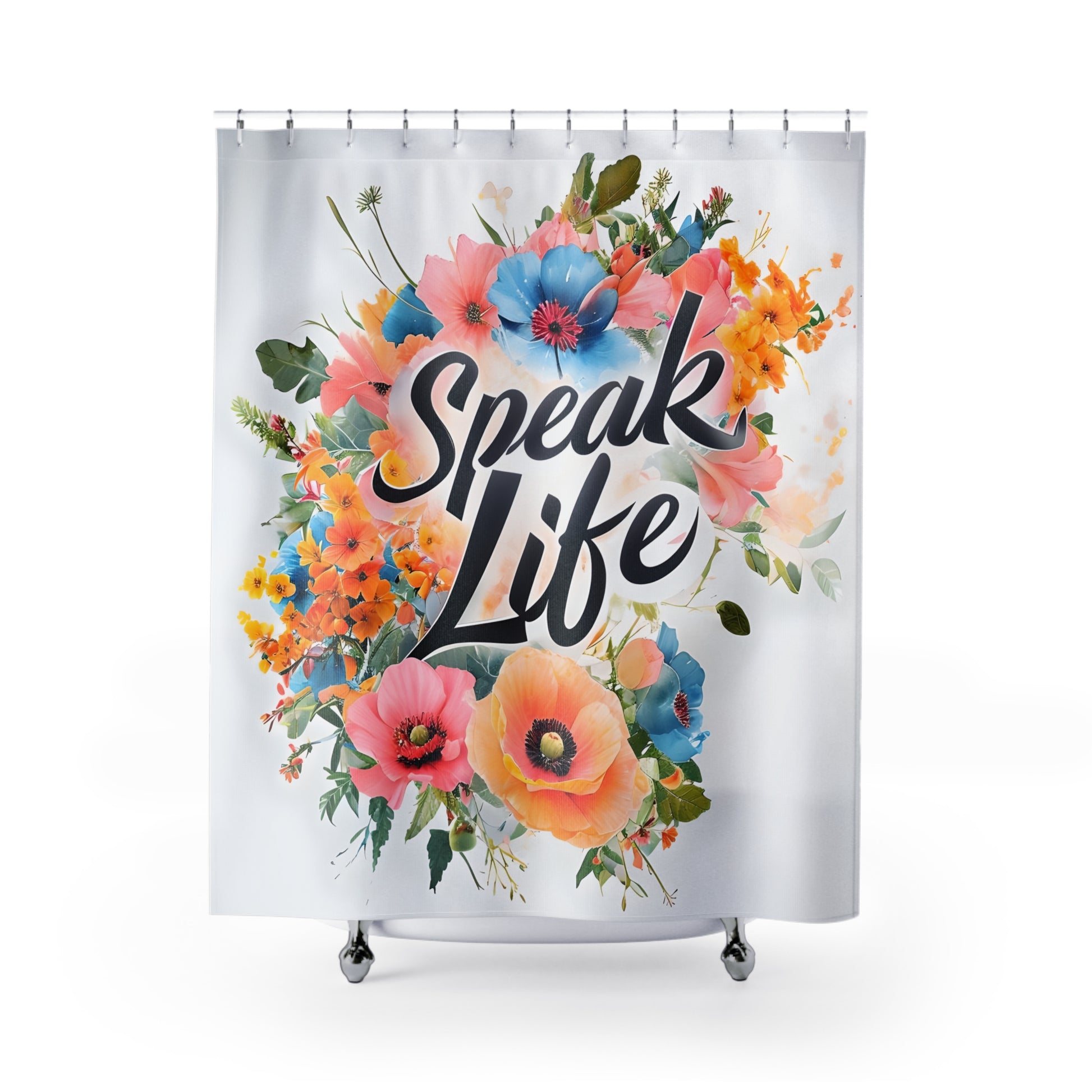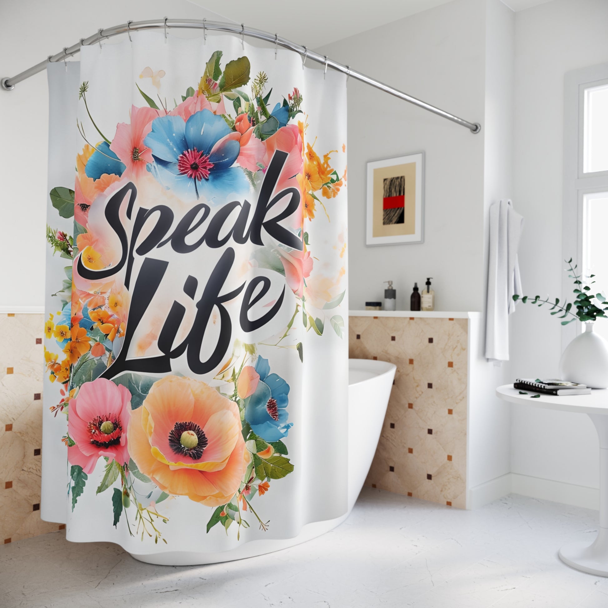 Transform your bathroom into a vibrant oasis with this beautifully designed shower curtain. Featuring a stunning floral motif and the uplifting phrase 'Speak Life', this product radiates positivity and adds a touch of charm to your daily routine. Made from durable polyester, it not only enhances your space but also withstands moisture and daily use. This shower curtain is perfect for anyone looking to bring a fresh vibe to their home, making it an ideal gift for friends, family, or yourself. Celebrate special occasions like housewarmings, birthdays, or even holidays like Mother's Day by elevating your bathroom decor with this eye-catching piece.