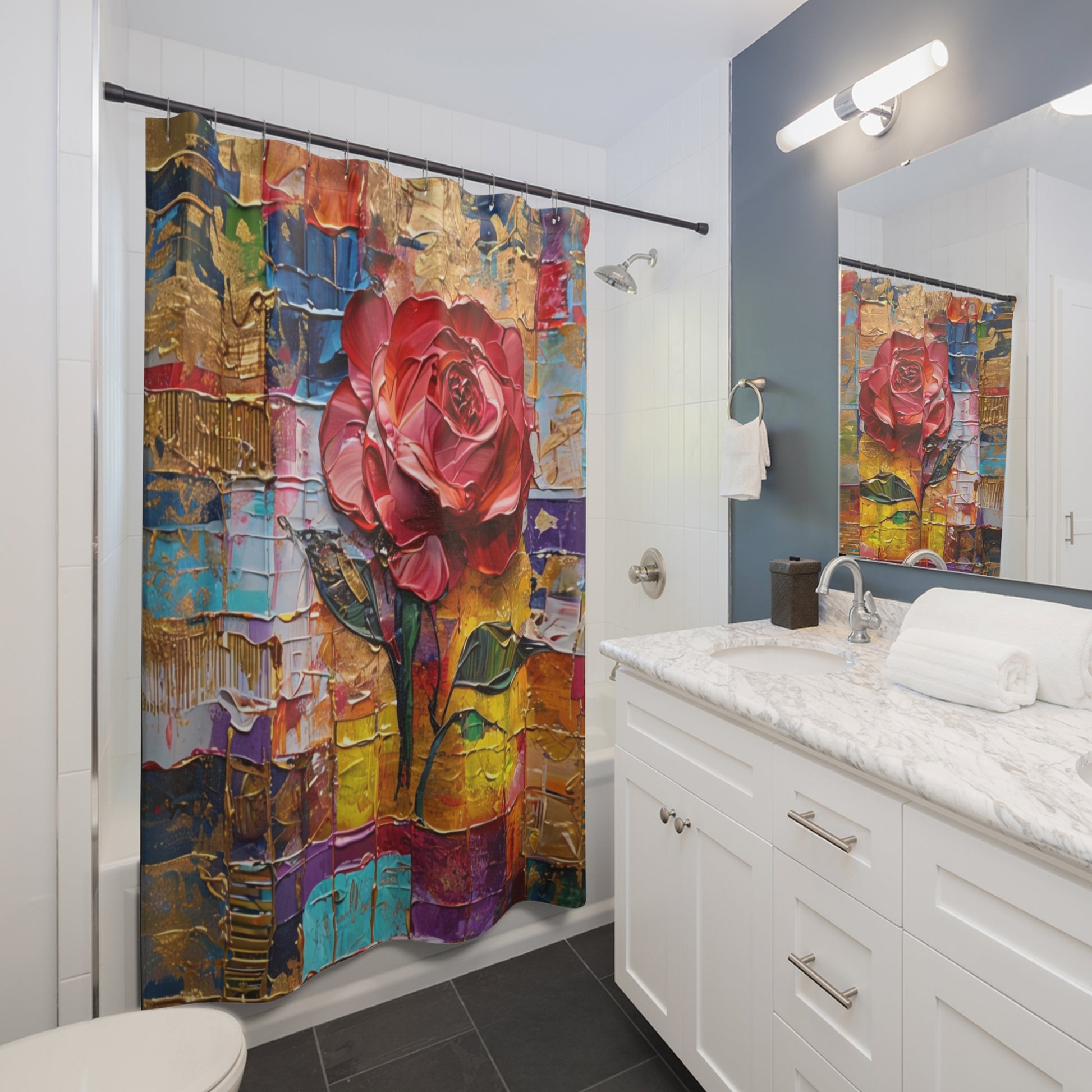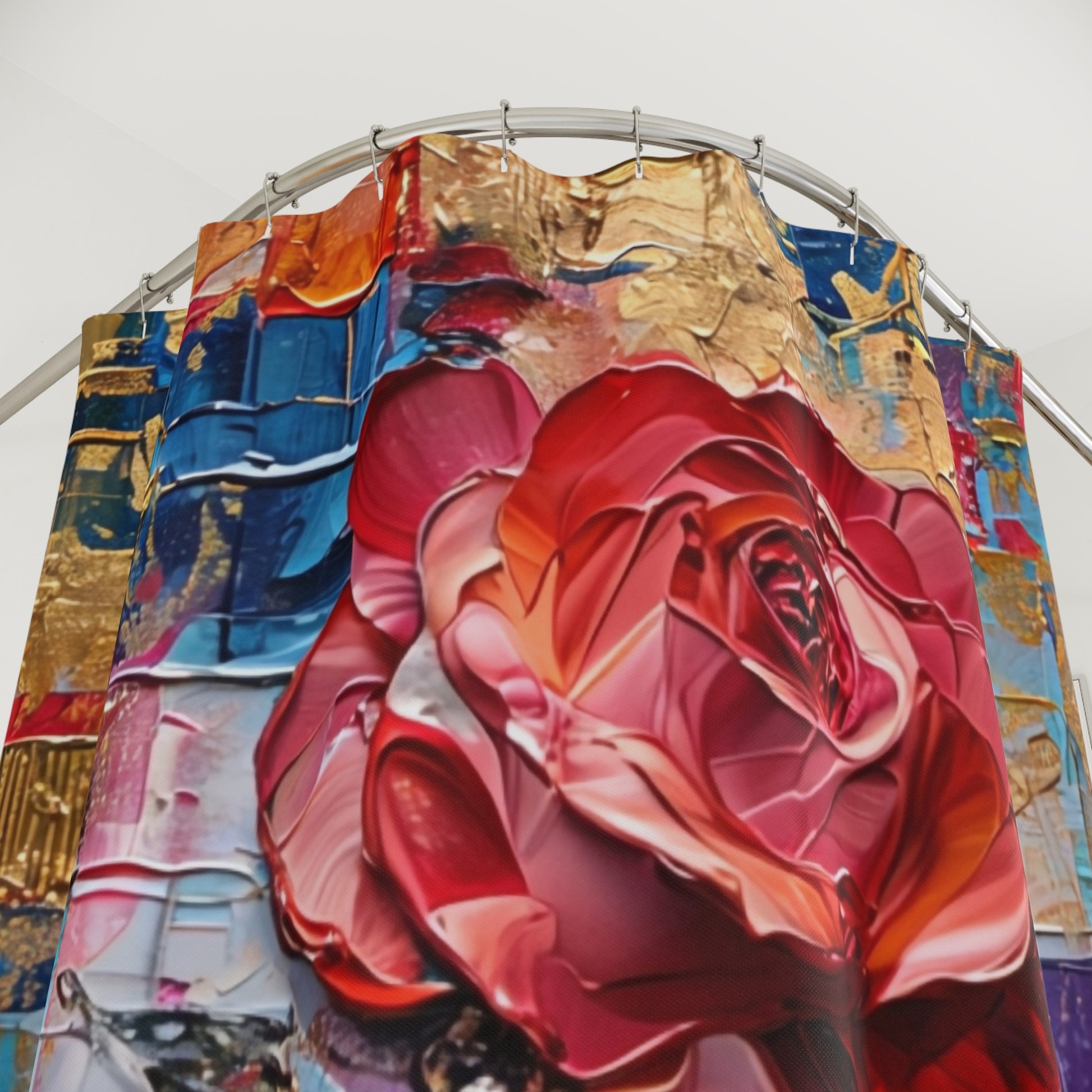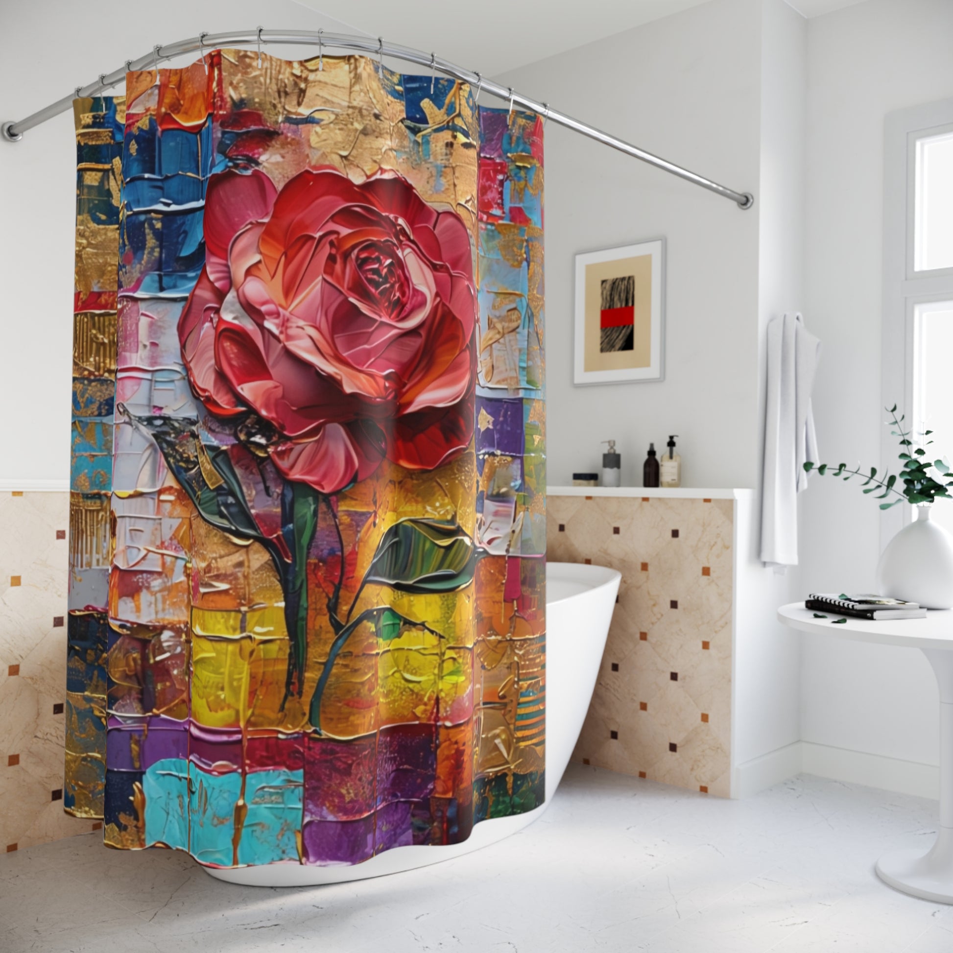 This shower curtain is here to add an original touch to any bathroom with your designs. Made with highly durable polyester, this curtain stays like new for a long time to come and is a perfect printing area for your art. Please note: While polyester offers adequate protection against water, a liner might be necessary for full waterproofness.